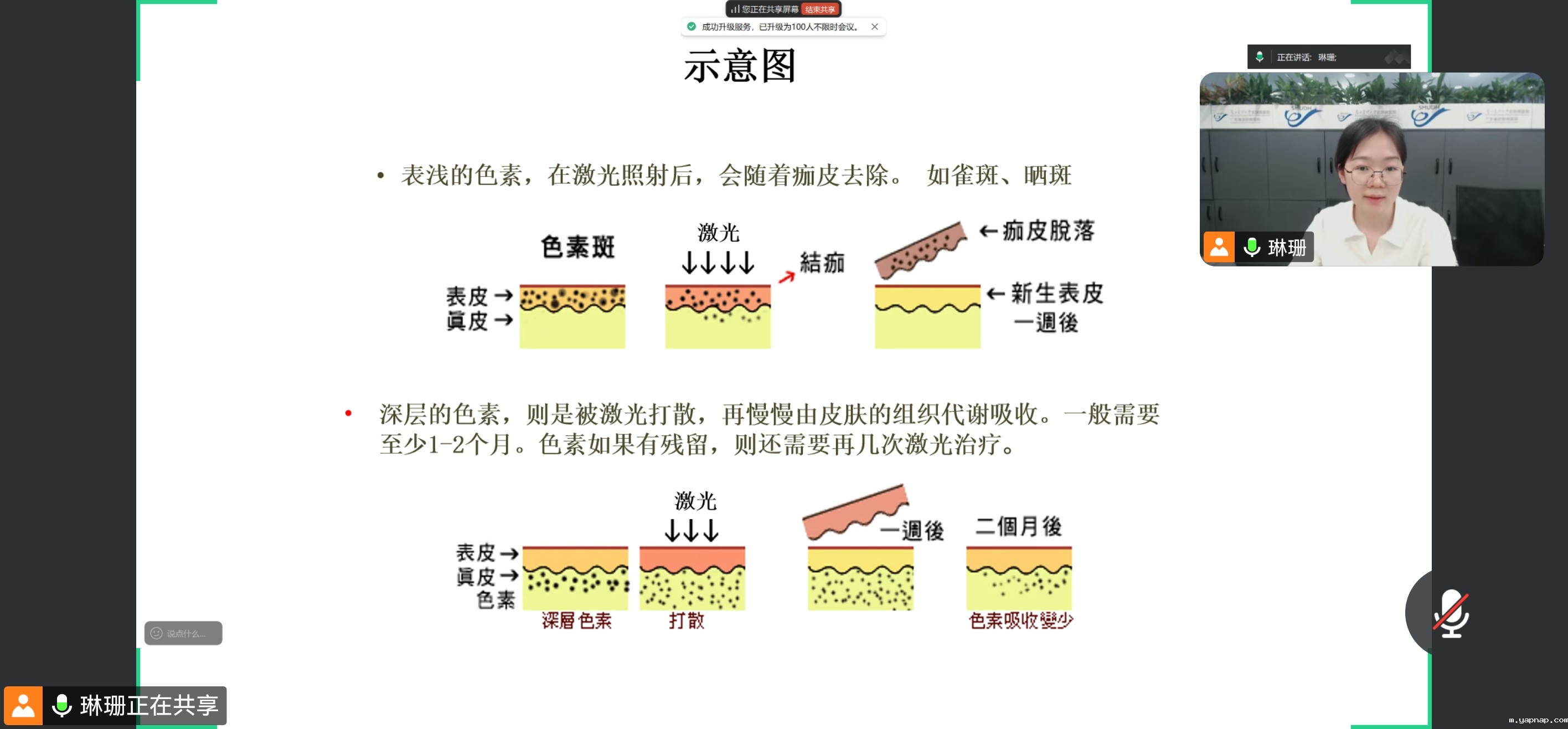 中心主管易贞围绕医疗美容领域,系统且全面地展开讲解,她深入剖析激光、射频、注射等核心技术原理;针对祛斑、祛痘、抗衰等消费者高频需求,结合临床实践,详细阐述了对应的皮肤美容治疗手段;同时,结合实际案例,分享了科学的效果评估方法。