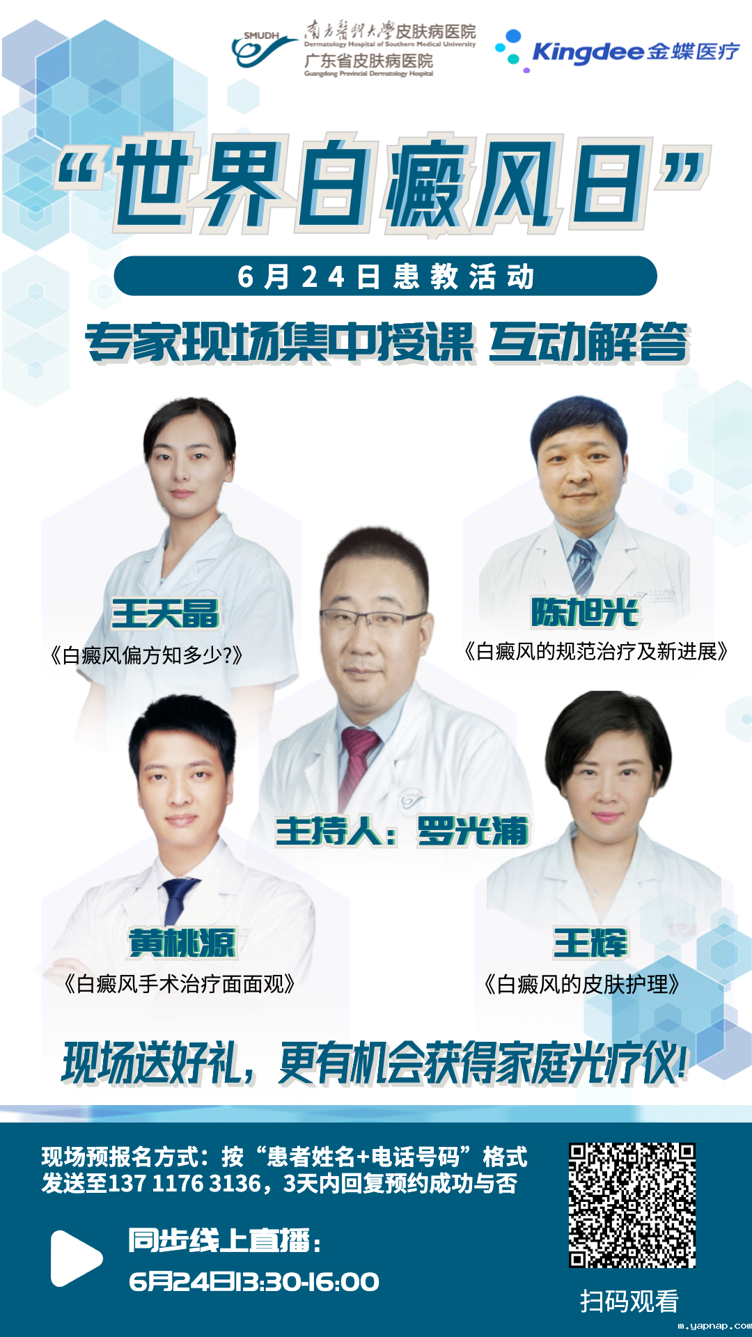 在“世界白癜风日”来临之际,为普及白癜风防治知识,提高白癜风患者的生活质量,悠米游戏中心安卓版将于6月24日下午在医院举办白癜风医患互动活动,由我院白癜风专病中心专家团队针对患者及患者家属最关心的问题进行集中授课与互动问答。