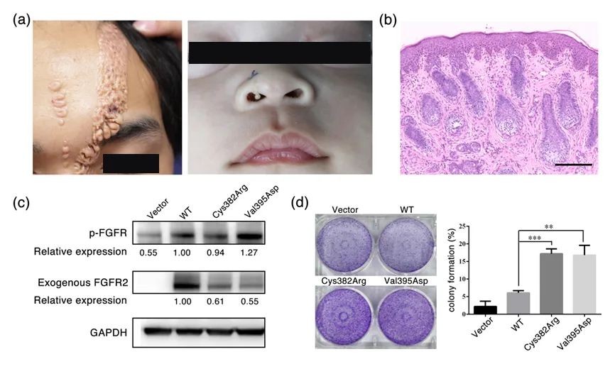 nevus》的文章。该研究首次证实了FGFR2的功能获得性变异为毛囊痣的发病原因,该发病机制的阐明为其后续利用FGFR2抑制剂进行治疗毛囊痣提供了基础。