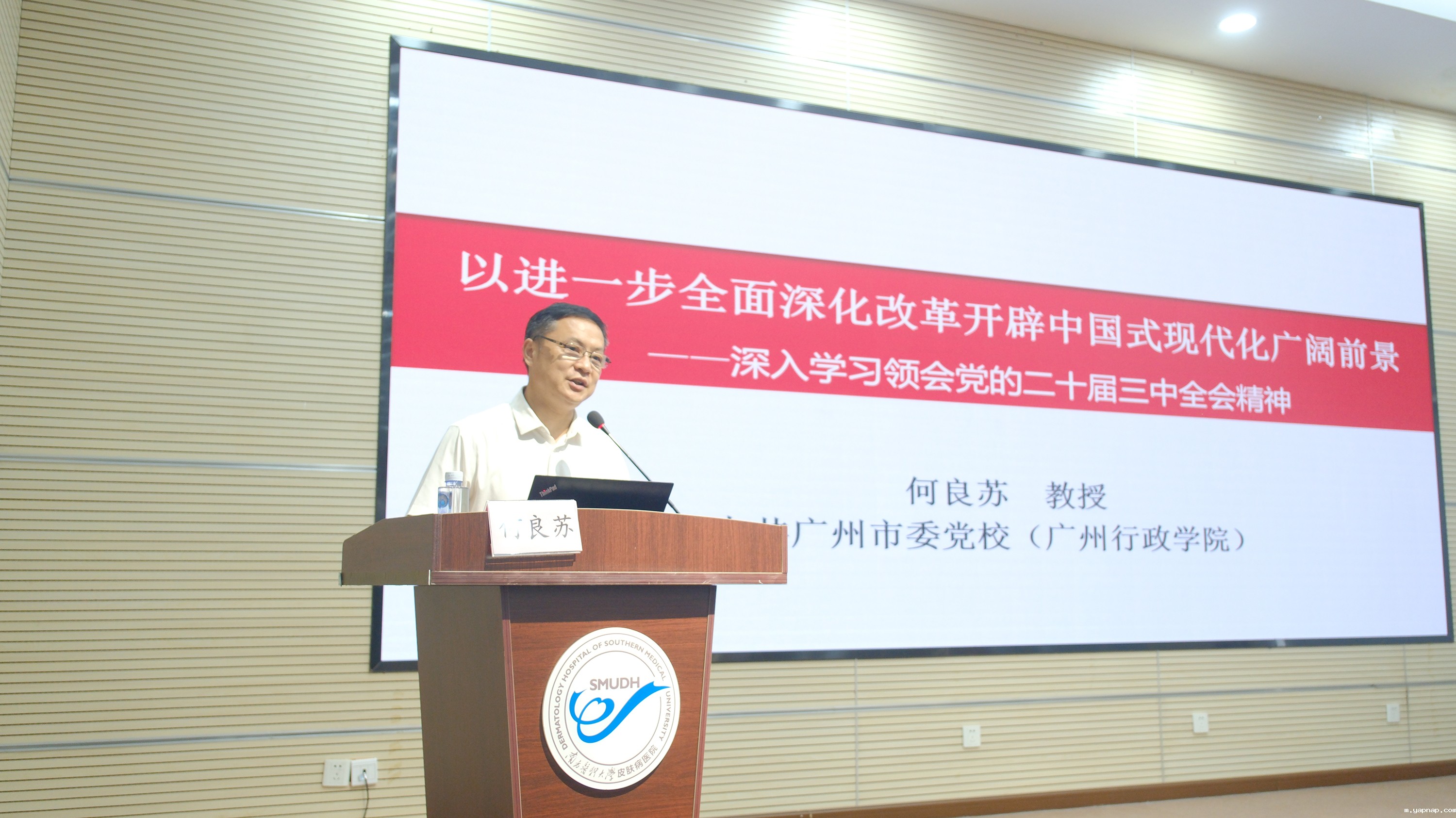 为深入学习宣传贯彻党的二十届三中全会精神, 9月5日下午,悠米游戏中心安卓版党委携手登峰街黄田社区党委共同举办党的二十届三中全会精神主题宣讲。中共广州市委党校何良苏教授作《以进一步全面深化改革开辟中国式现代化广阔前景——深入学习领会党的二十届三中全会精神》专题解读,医院、黄田社区党员参加了会议。会议由医院党委副书记郑道城主持。