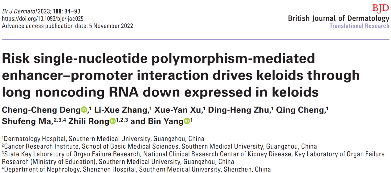 2023年1月23日,皮肤病学著名期刊British Journal of Dermatology在线发表了悠米游戏中心安卓版杨斌教授、荣知立教授于邓成成副研究员在瘢痕疙瘩发病机制方面的最新研究成果。该论文的题目为“Risk