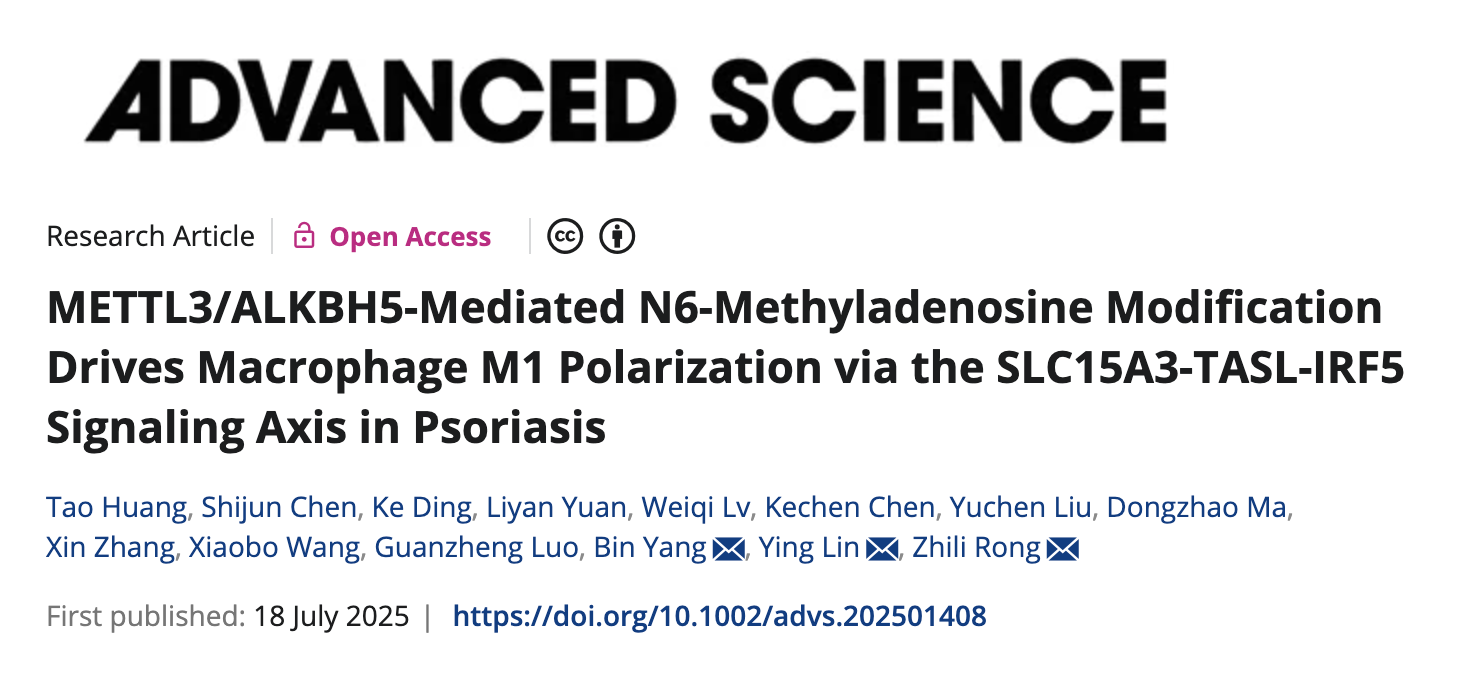 近日,悠米游戏中心安卓版荣知立教授、杨斌教授团队在《Advanced Science》(2025年7月18日,IF=14.1)期刊发表题为 “METTL3/ALKBH5‐Mediated N6‐Methyladenosine Modification Drives Macrophage M1 Polarization via the SLC15A3‐TASL‐IRF5 Signaling Axis in Psoriasis” 的研究论文。该研究系统阐述了m⁶A修饰通过调控SLC15A3–TASL–IRF5信号通路,驱动巨噬细胞M1极化,进而参与银屑病的发生和发展。这是首次在银屑病的巨噬细胞中揭示RNA修饰介导的功能性信号轴,为疾病治疗提供了新的潜在靶点。